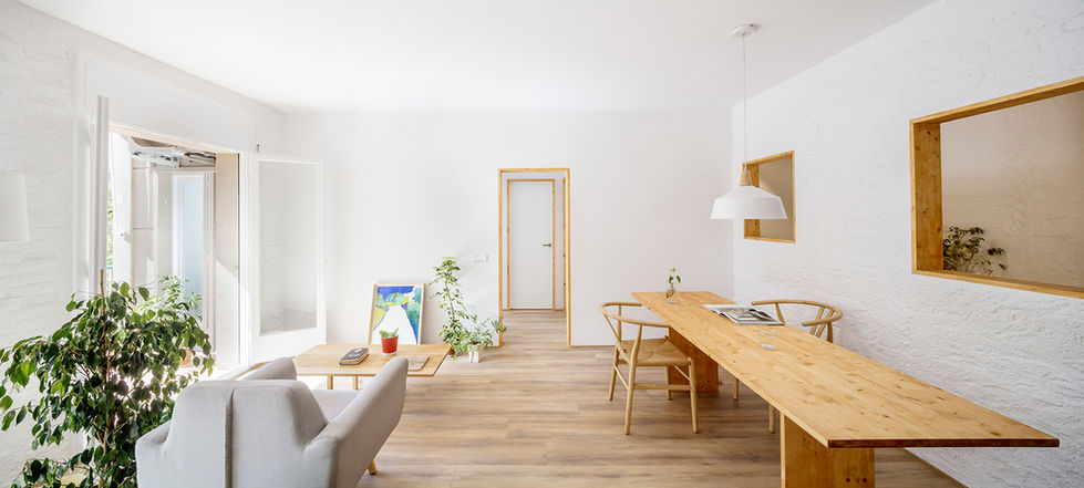 The perforations in the load-bearing wall, which separates the kitchen from the living-dining room, were partially filled in to create new interior windows. This abstract facade, composed of wooden frames on a white painted brick wall, creates the perception that the living room is a semi-outdoor space. From the kitchen, the new, light and geometric nature of the timber framework contrasts with the old, heavy and imperfect character of the building's load-bearing wall. The cooking space consists of a simple 5-meter-long bar that faces the outside and receives natural light through its windows.